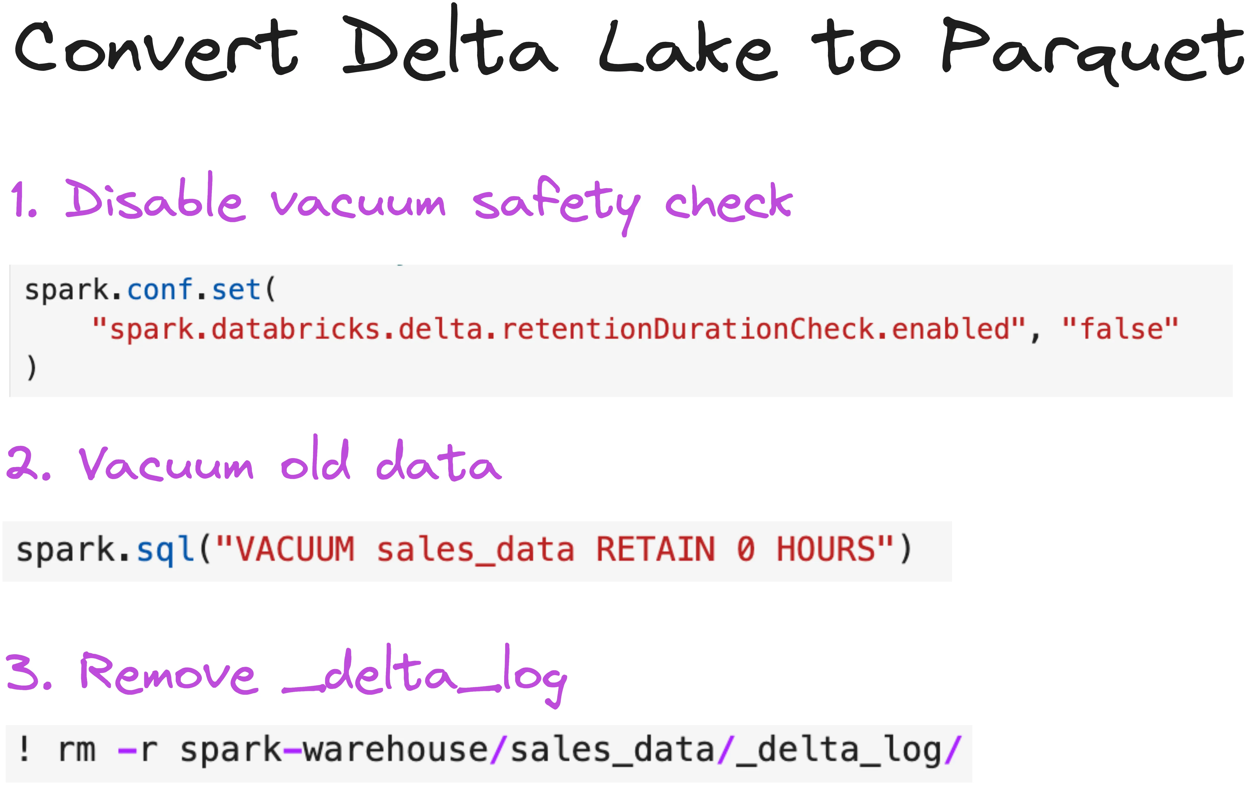 From a pure performance perspective, you usually don’t want to convert from Delta Lake to Parquet if you can avoid it. Delta Lake is almost always faster and more reliable. Only do this if you’re sure you no longer need features like versioning or transaction management.
